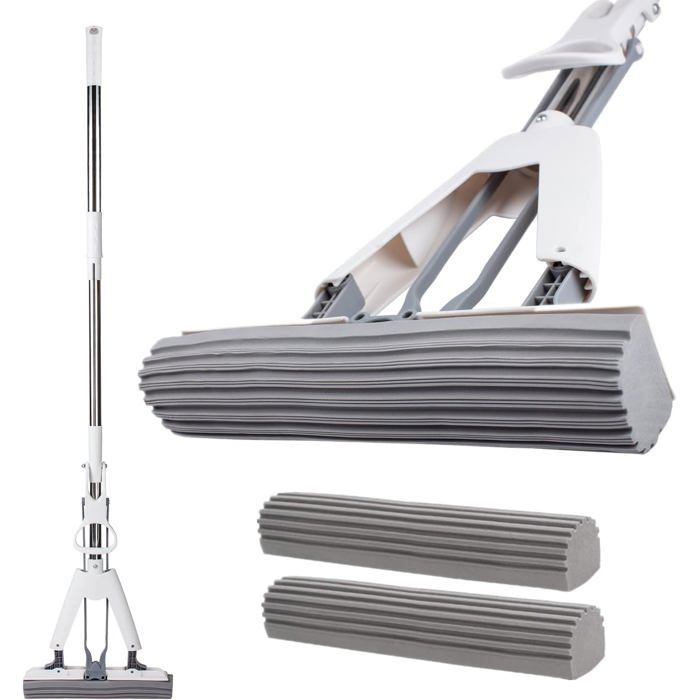 Squeeze Mop - Manche télescopique avec 2 têtes de rechange - Balai éponge pour le nettoyage des sols - Balai durable pour les tâches de nettoyage dans la cuisine, le salon, la salle de bain, la salle