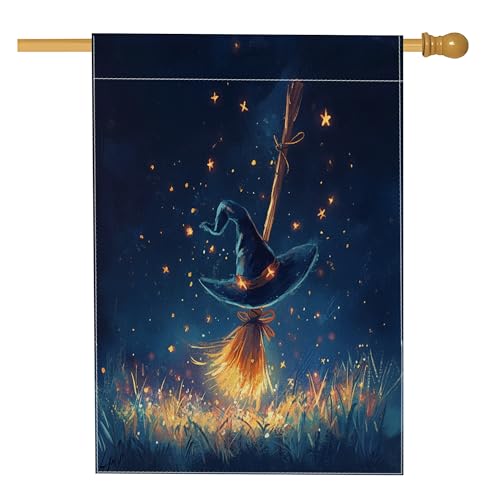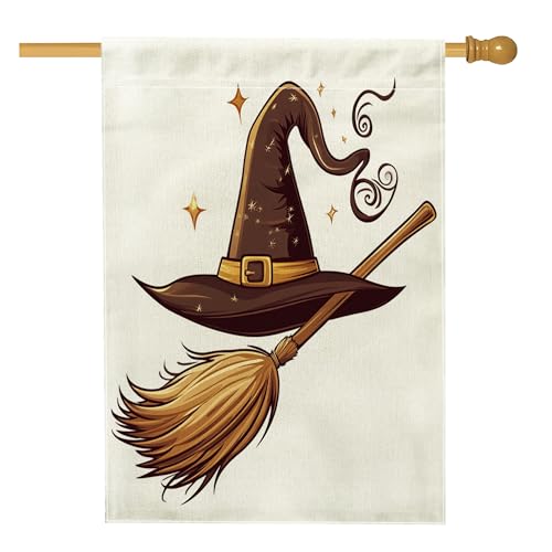 Balai magique de sorcière d'Halloween pour l'avant de la cour, arrière-cour en lin - 71,1 x 101,6 cm - Double face pour l'extérieur, chapeau de sorcière amusant - Drapeau imprimé pour la maison et