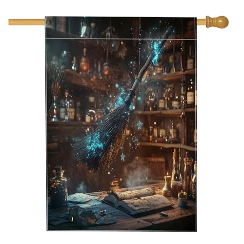 Balai magique de sorcière d'Halloween pour l'avant de la cour, arrière-cour en lin - 71,1 x 101,6 cm - Double face pour l'extérieur, livre de sorcière fantaisie cool et amusant - Drapeau imprimé pour
