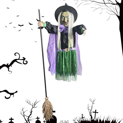 Décor De Sorcières Horrible pour L'extérieur avec des Sons d'horreur Et des Yeux Brillants 180cm Décor De Sorcière Volante sur Balai pour La Cour Jardin Fête Halloween Décorations