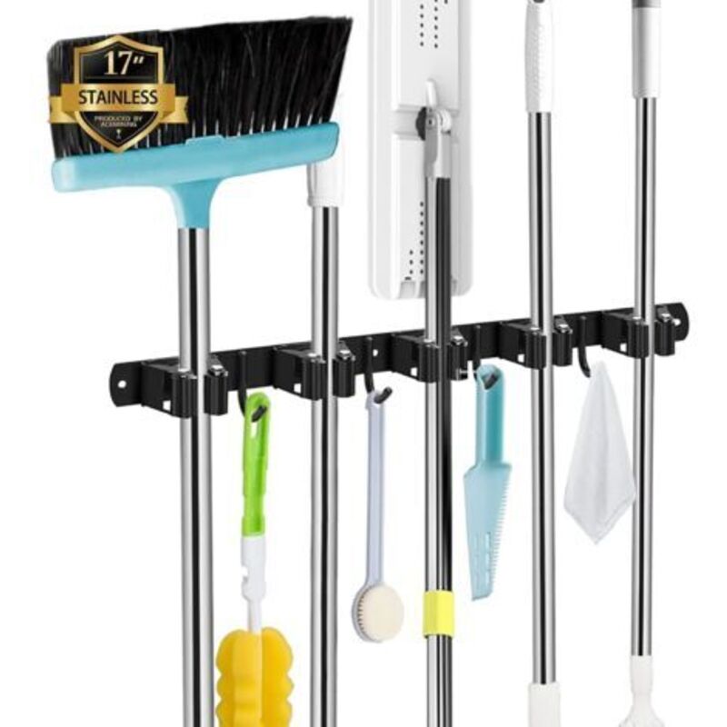 Buhdjfnke Support mural en acier inoxydable, 5 supports et 4 crochets, organisateur de balais, porte-outils pour , la cuisine, , noir