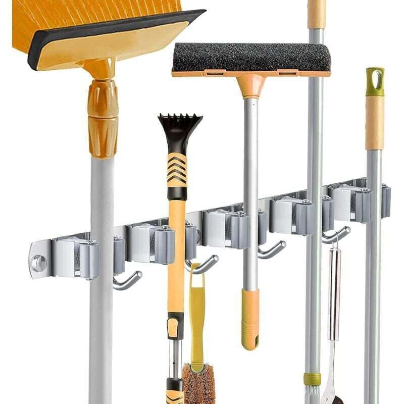 Porte-balais mural avec crochets adhésifs, organiseur de rangement pour la maison, le jardin, le placard et la cuisine (4 clips, 5 crochets)