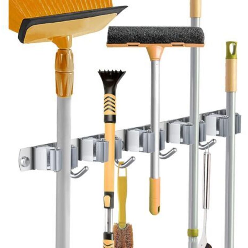 Porte-balais mural rtgpt en acier inoxydable avec 4 emplacements et 5 crochets, idéal pour cuisine, salle de bain, garage et jardin, couleur grise.