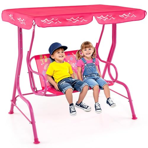 GOPLUS Balancelle de Jardin Extérieure pour Enfant, Balancelle Enfant 2 Places avec Auvent Réglable et Ceintures de Sécurité, Charge 80 KG, pour Jardin, Balcon, Terrasse (Sirène Rose)