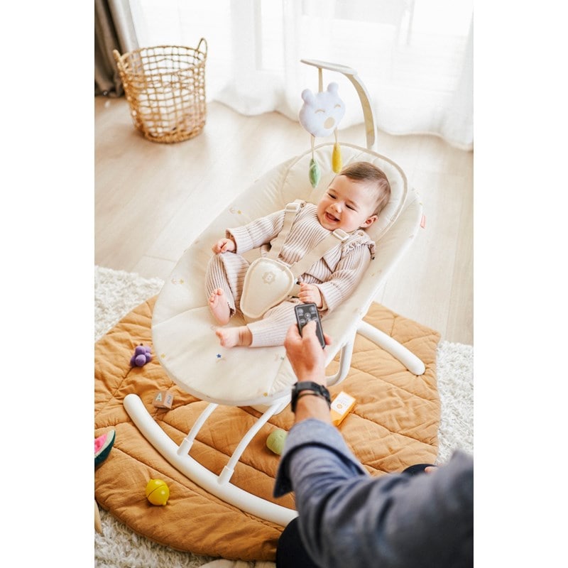 Badabulle Balancelle Electrique Bébé Latérale Buddy Cream - 3 Vitesses de Balancement - 8 Berçeuses - Arche de jeux - Garantie à vie