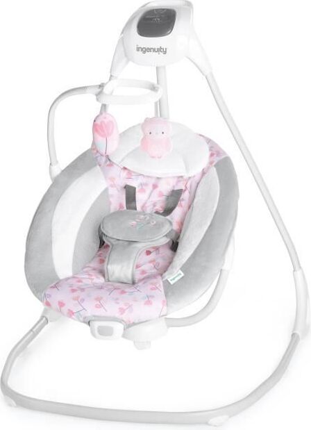 Ingenuity, Balancelle compacte pour bébé Flora la licorne, 6 vitesses de balancement, 3 réglages de minuterie, 12 mélodies apaisantes, Barre d’activités amovible, rose, dès la naissance à 9 kg