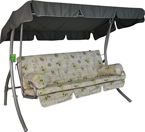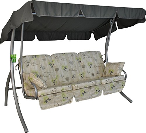 Angerer Balancelle de Jardin Comfort 3 Places, Acier Galvanisé, Convertible en Lit, Toit Parasol Réglable, Coussins Rembourrés (Beige à Motifs Olive)