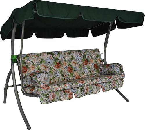 Angerer Balancelle de Jardin Comfort, 3 Places Convertible en Lit, Structure en Acier Galvanisé, Toit Parasol Réglable, Coussins Rembourrés, Capacité 270 kg (Vert-Orange à Fleurs)