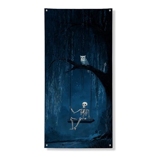 Bannière décorative de porte squelette effrayante, scène de nuit sombre avec hibou et balançoire, décoration d'intérieur et d'extérieur, fournitures de vacances festives 91,4 x 183 cm