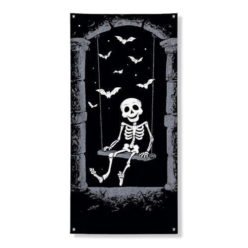 Couverture de porte squelette d'Halloween décorative, motif squelette balançoire effrayant, décoration d'intérieur ou d'extérieur de vacances hantée 91,4 x 183 cm
