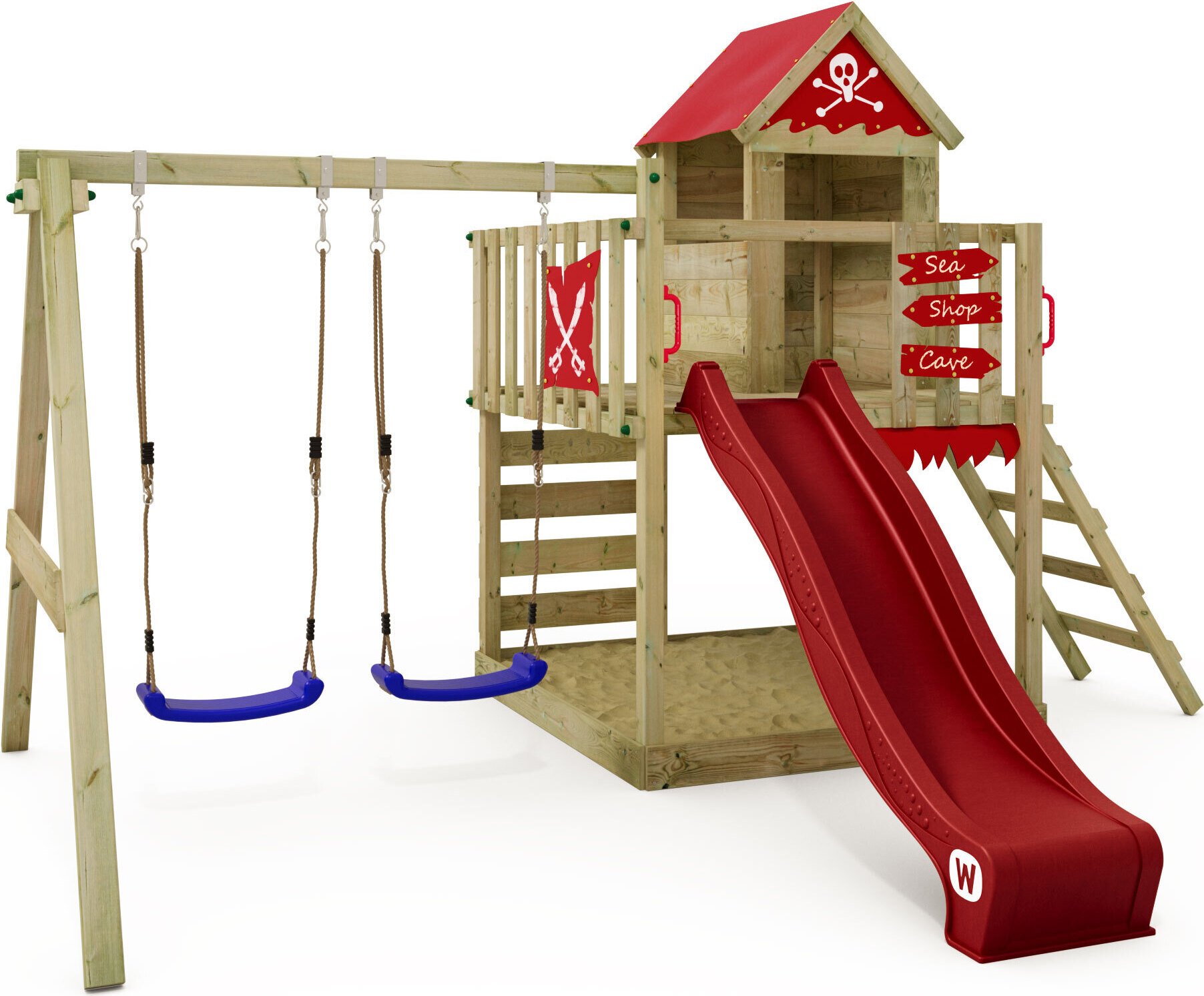 WICKEY Tour de jeux Smart Cave avec balançoire & toboggan, cabane avec bac à sable, échelle d'escalade & accessoires de jeu - rouge