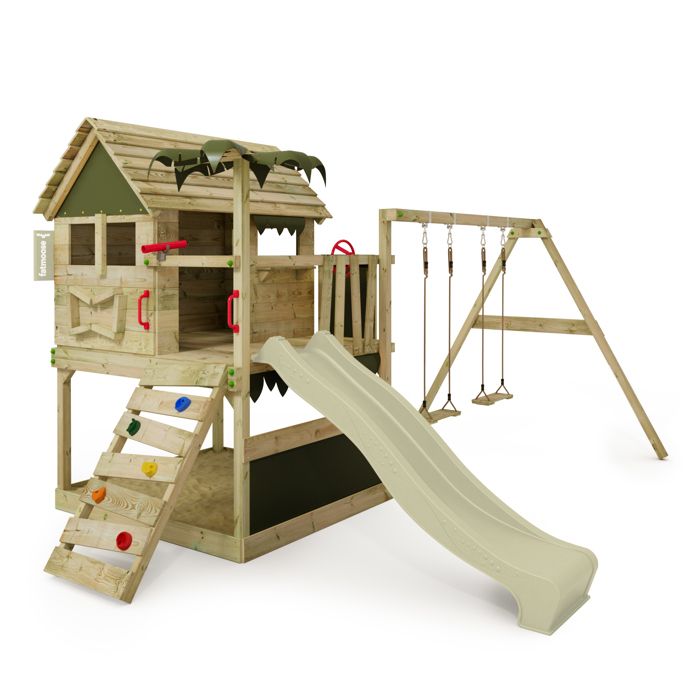 Tour de jeux en bois woupi balançoire, trapèze, toboggan, mur escalade, cabane