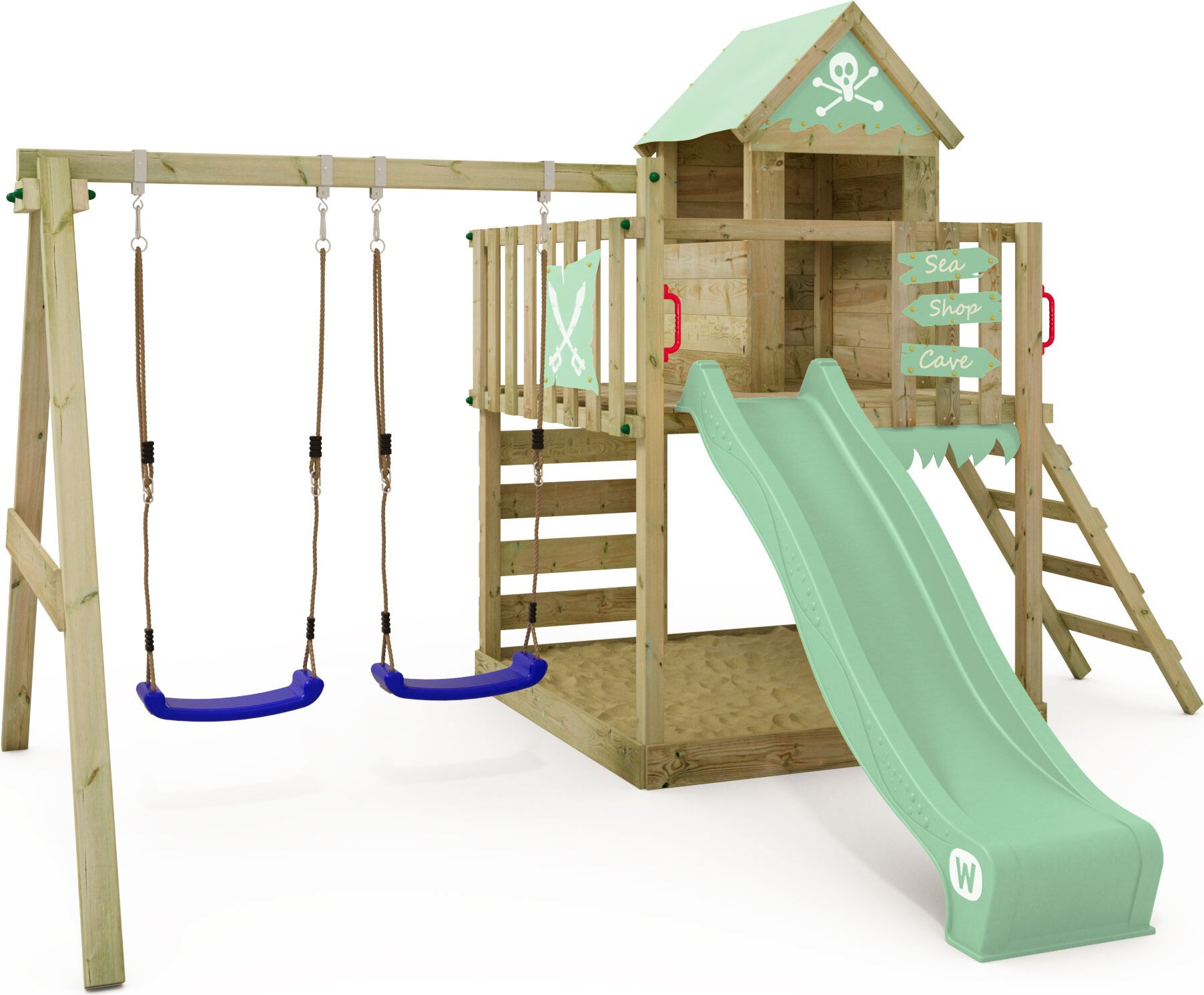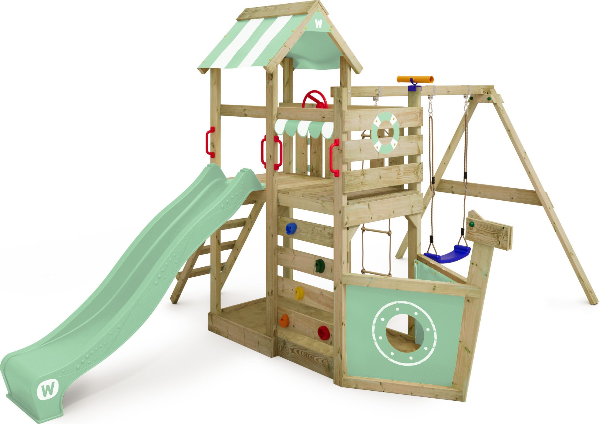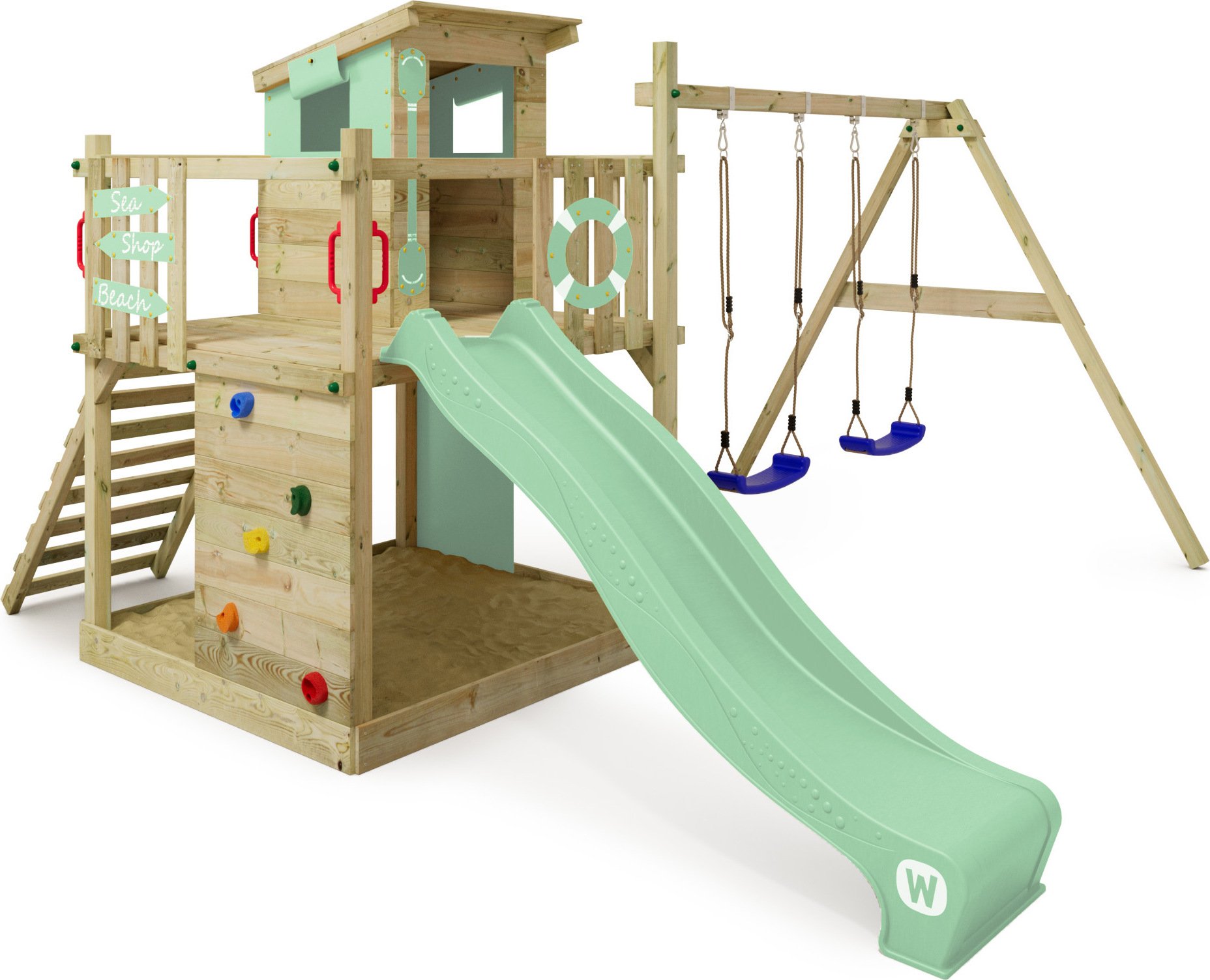 WICKEY Tour de jeux SeaFlyer avec balançoire & toboggan, cabane avec bac à sable, échelle d'escalade & accessoires de jeu - vert pastel