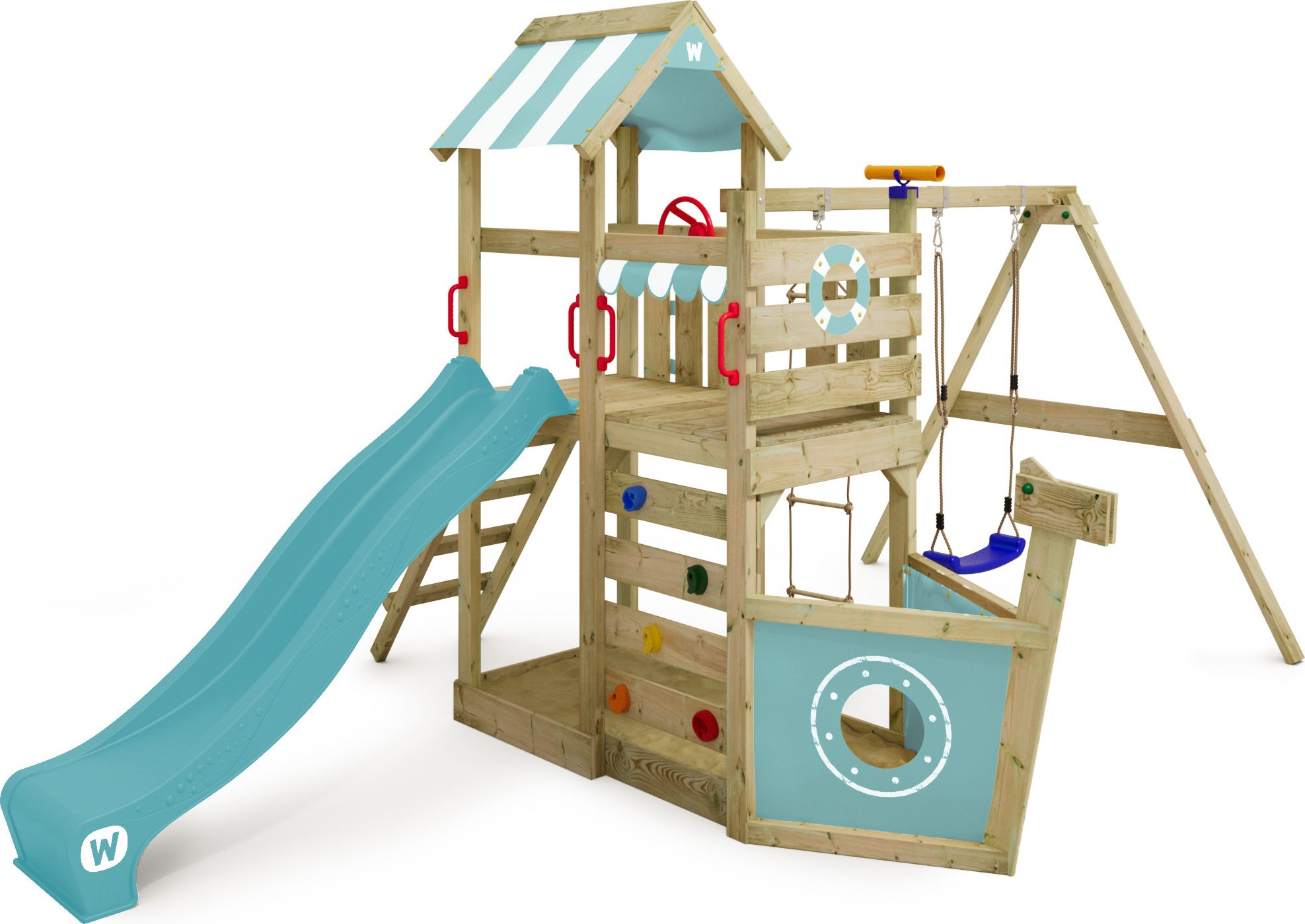 WICKEY Tour de jeux SeaFlyer avec balançoire & toboggan, cabane avec bac à sable, échelle d'escalade & accessoires de jeu - bleu pastel