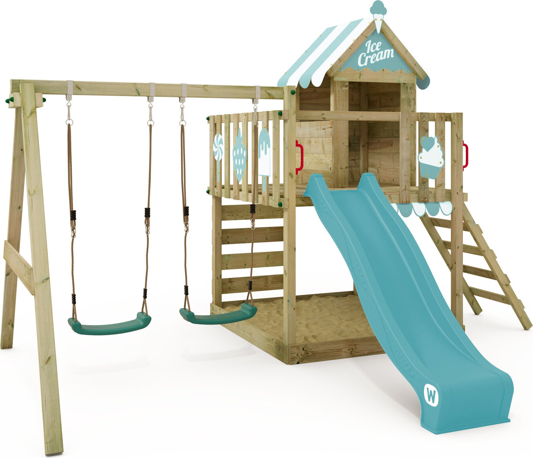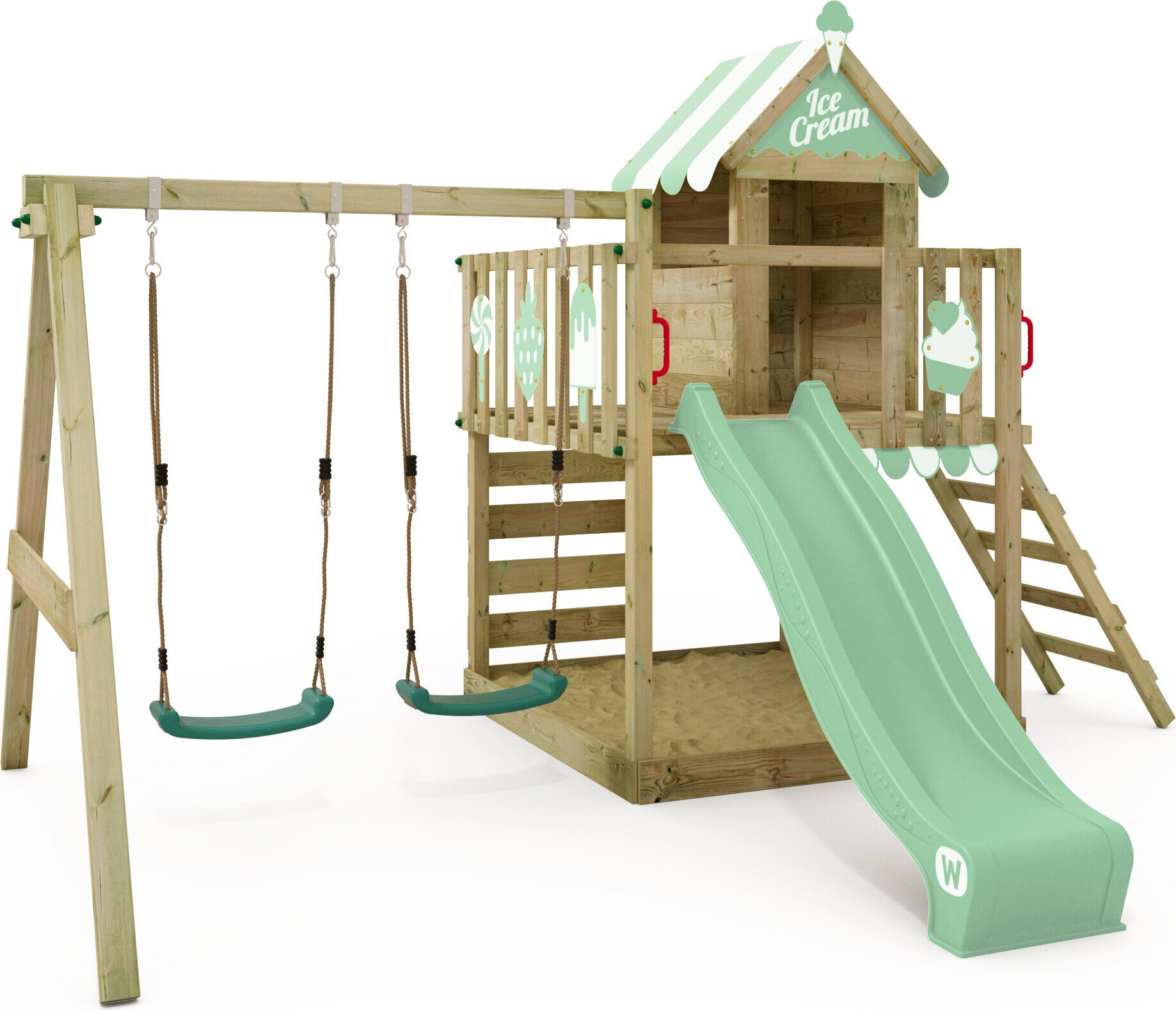 WICKEY Tour de jeux Smart Candy avec balançoire & toboggan, cabane avec bac à sable, échelle d'escalade & accessoires de jeu - vert pastel