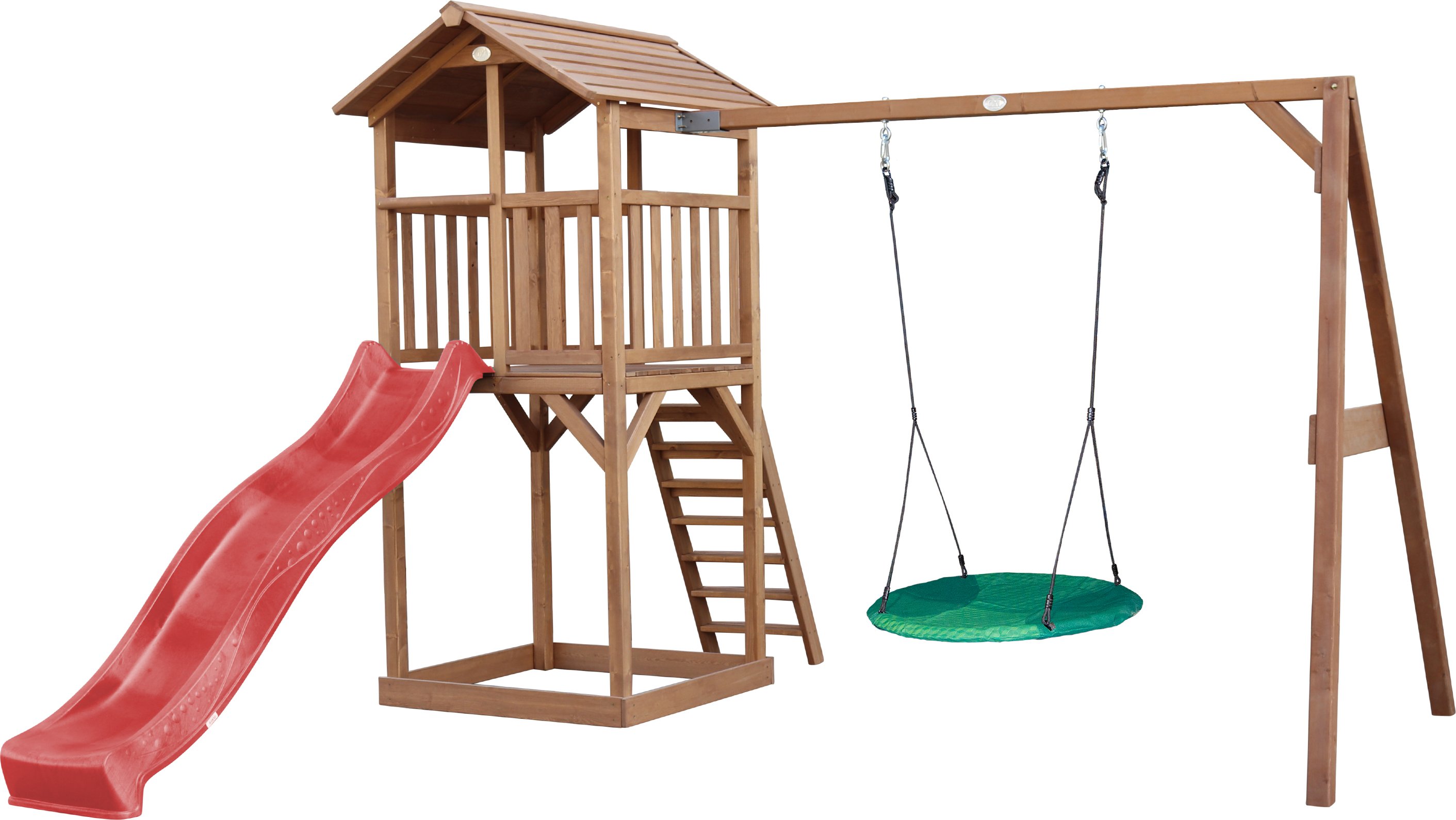 AXI Beach Tower Aire de Jeux avec Toboggan en rouge, Balançoire Nid d'oiseau Vert & Bac à Sable | Grande Maison enfant extérieur en marron | Cabane