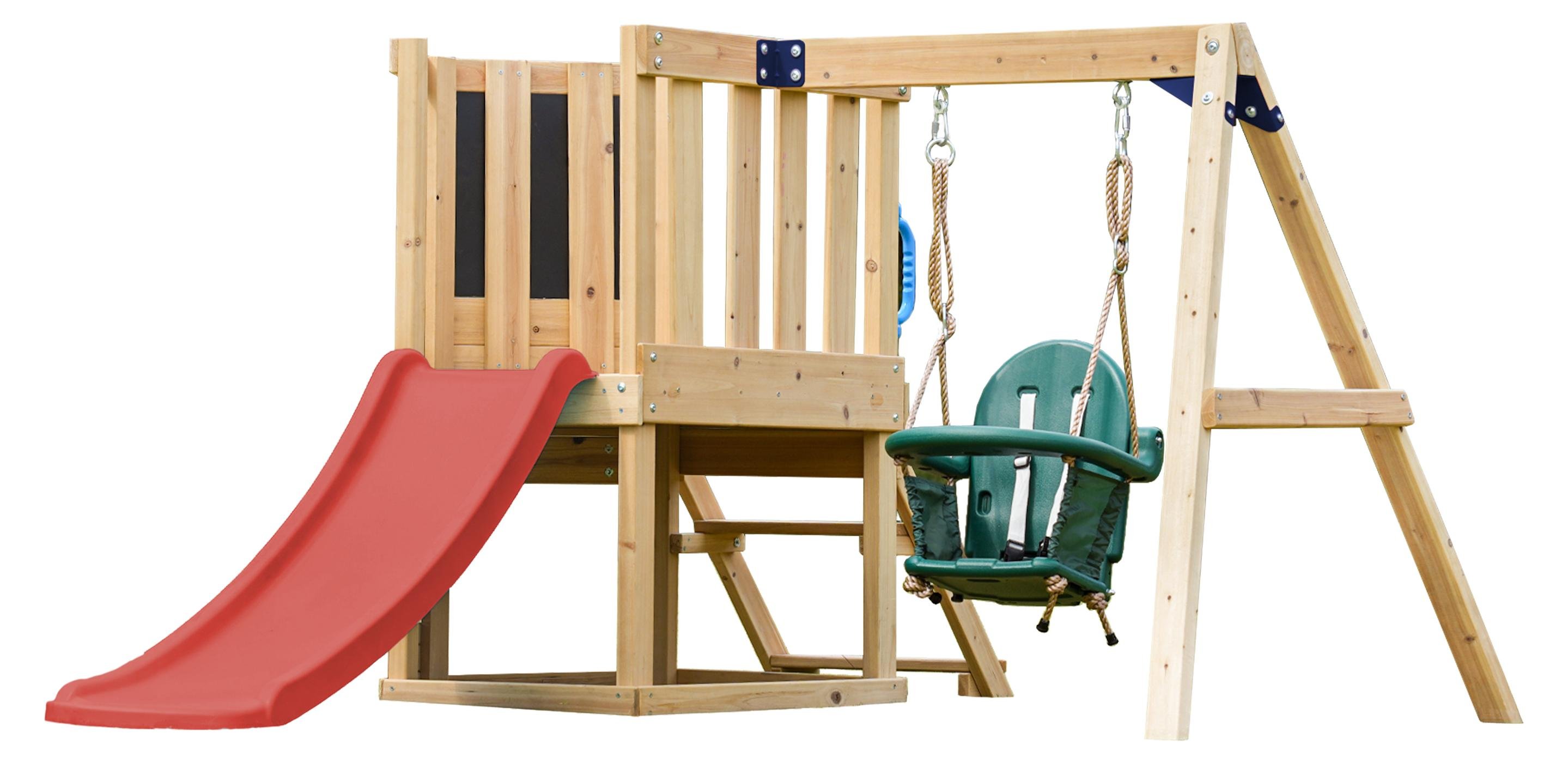 AXI Timo Mini Aire de Jeux - Toboggan Rouge | Cabane pour Enfant avec Balançoire pour Bébé, Mur d'Escalade et Tableau Noir | Structure de Jeux pour