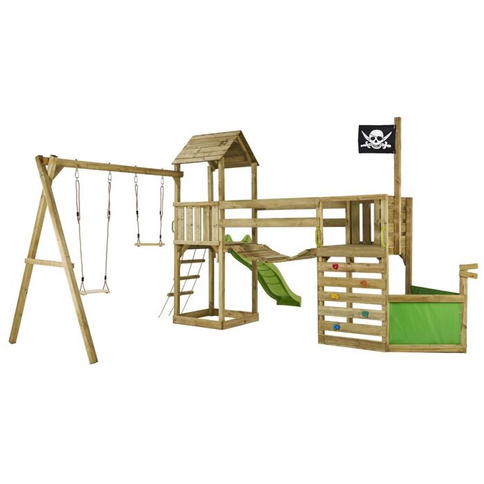 Aire de jeux pirate en bois WILLI avec vigie - Balançoire trapèze toboggan mur descalade cabane sur plateforme pont suspendu