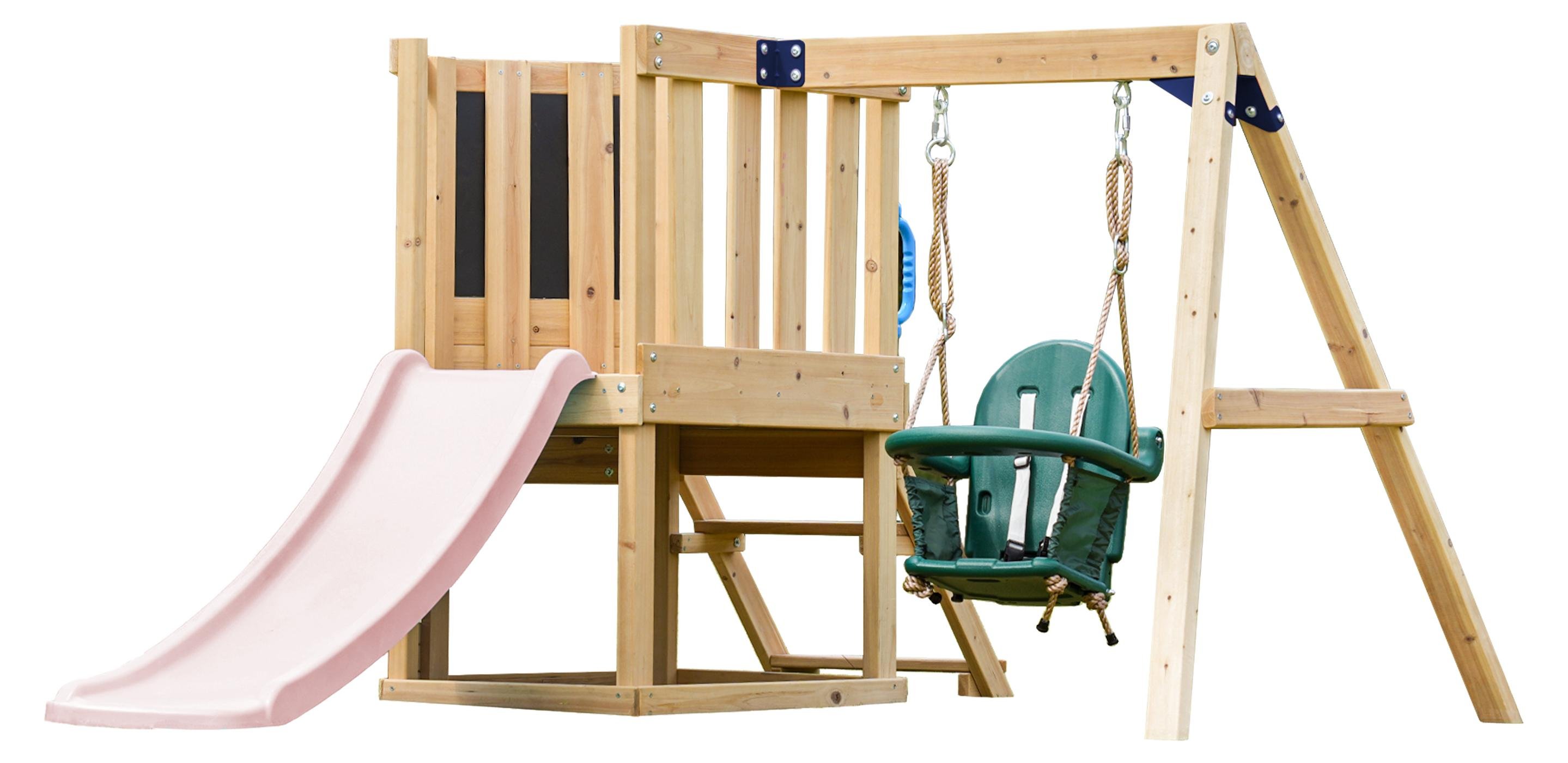 AXI Timo Mini Aire de Jeux - Toboggan Rose Pastel | Cabane pour Enfant avec Balançoire pour Bébé, Mur d'Escalade et Tableau Noir | Structure de Jeux