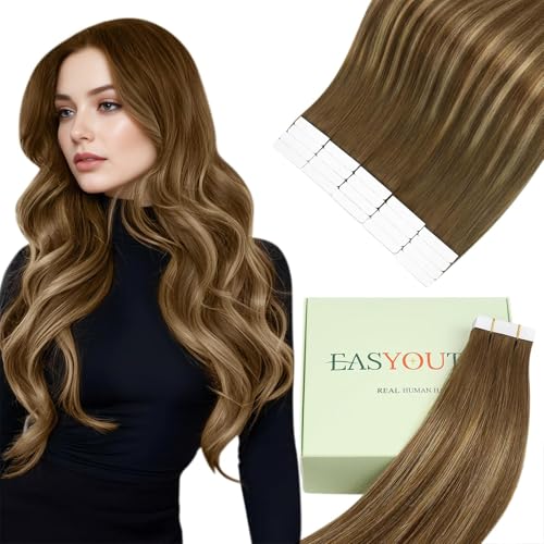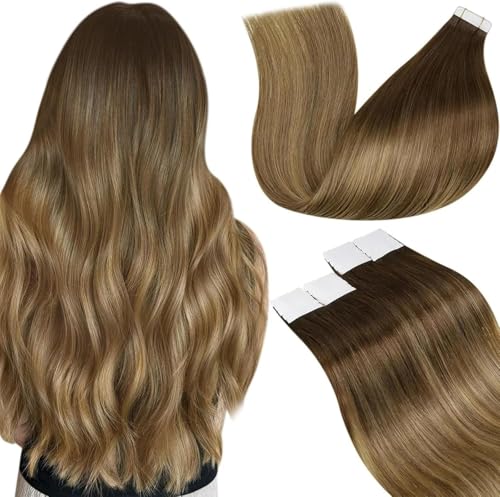 Easyouth Extension Adhesive Cheveux Naturel Balayage Brun Extension Cheveux Humains de Adhesif Brun Foncé Ombre Blond Clair et Brun Adhesif Extension Cheveux Vrais 35 cm 40g 20Pcs