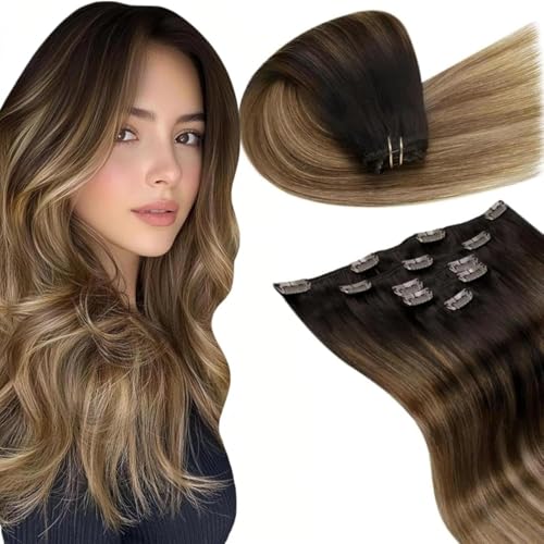 LaaVoo Extension Cheveux Naturel Clip Balayage Noir Brun Foncé Ombre Caramel Platine 120g 40cm 7pcs Extension Clip Cheveux Naturel Vrais Humain Noir Marron Lisse #1b/4/27