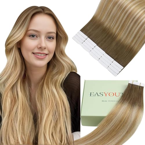 Easyouth Extension Adhesive Cheveux Humain Balayage Blonde Extension Cheveux Humains de Adhesif Ombre Brun a Clair avec Blond Vrais Extension Cheveux Adhesif Droit 50 cm 50g 20Pcs