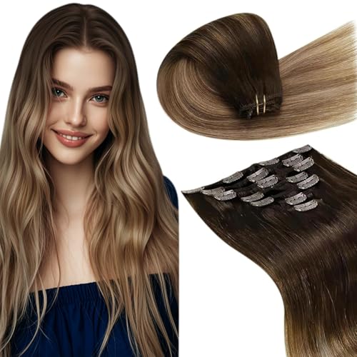 LaaVoo Extension Cheveux Naturel Clip Brun Foncé Balayage Marron Moyen Doré 40cm Extension Clip Cheveux Vrais Humain Marron Ombre Platine 5pcs 80g Lisse #3/8/24