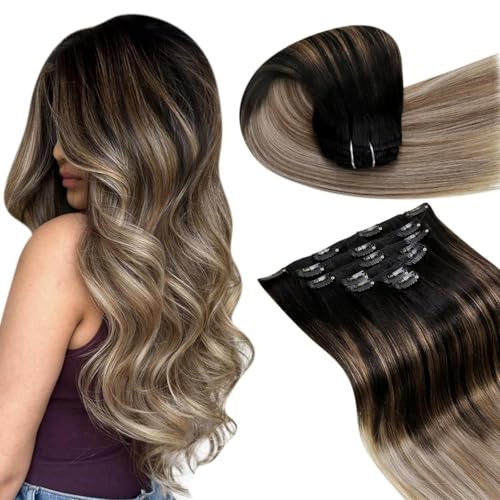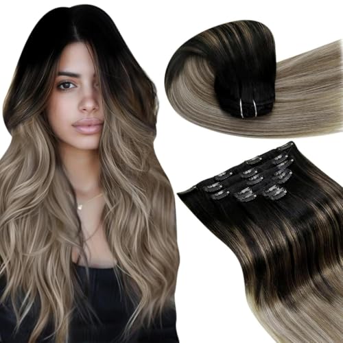 LaaVoo Extension Cheveux Naturel Clip Noir Brun Clair Balayage 120g 50cm 7pcs Extension a Clip Cheveux Naturel Humain Vrais Noir Marron Clair Ombre Moyen Dore Remy #1B/8/22