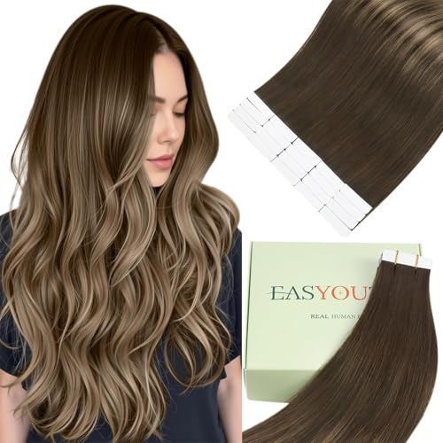 Easyouth Extension Cheveux Humain Adhesif Balayage Brun Extension de Cheveux Adhesive Humain Brun Fonce Ombre Brun Clair Extension Cheveux Vrais Adhesif Invisible 40 cm 40g 20Pcs