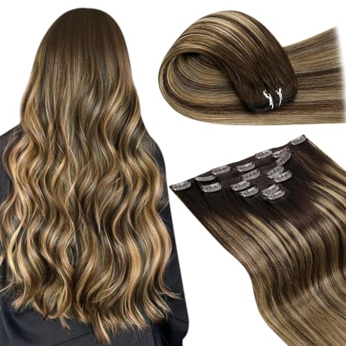 LaaVoo Extension Cheveux Naturel Clip Brun Foncé Balayage Marron Moyen Doré 45cm 5pcs 80g Extension Clip Cheveux Vrais Humain Marron Ombre Platine Lisse #3/8/24