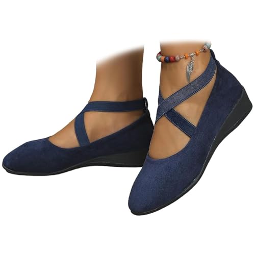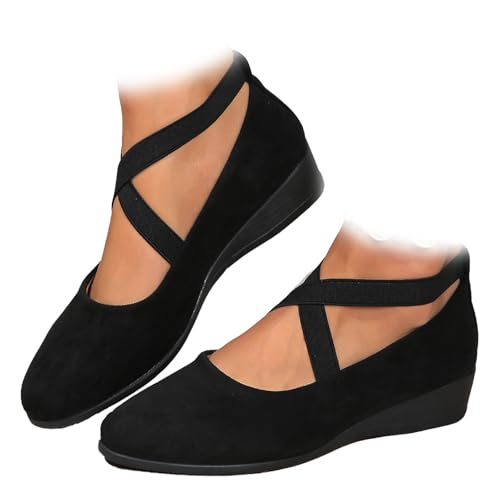 Chaussures compensées à lanières croisées élastiques confortables pour femmes, ballerines compensées à bout rond pour femmes, escarpins en daim élégants et confortables, Noir , 38 EU