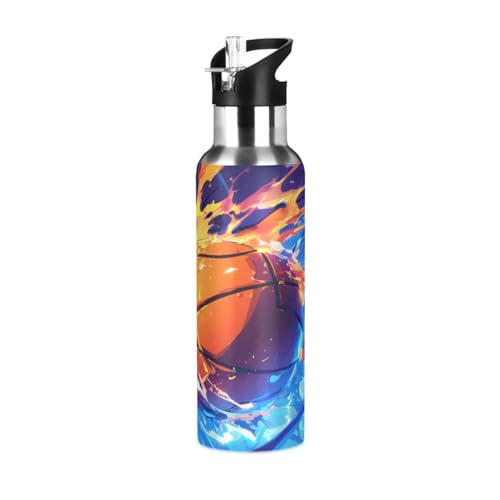 Niigeu Ballon De Basket-Ball Flamme Spatiale Bouteille d'eau Isotherme avec Paille en Acier Inoxydable Gourde, Sans BPA Gourdes Eau pour Enfant Sport Randonnée École Bureau (600ml/1L)