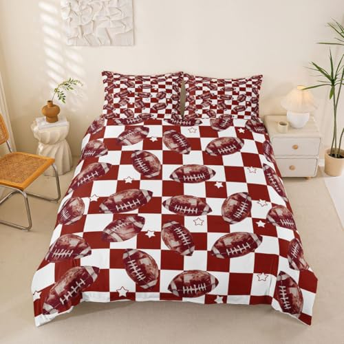 Homewish Housse de Couette Enfant Rugby,Parure de Lit 200x200 Tableau D'Échecs de Football Rétro,Sets de Housses de Couettes Jeux de Ballon Sportif,Couvre Lit Filles Garçons Adultes Marron Rouge Blanc