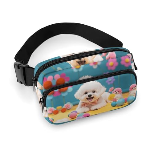 Sac banane pour homme et femme avec sangle réglable Bleu/beige Motif carré Pour tous les jours, Adorable chien bichon frisé, 20x13cm