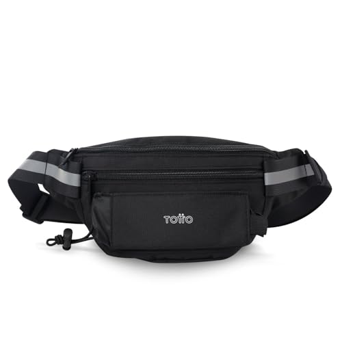 TOTTO - Sac Banane de Sport, modèle Running 2.0, Dimensions 24 x 11,5 x 7 cm, 2 Compartiments, Poche Avant pour Bouteille, détails réfléchissants, Porte-clés, Sangle réglable, Couleur Noire