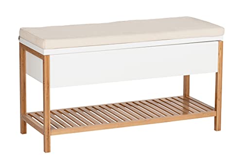 WENKO Banc d'entrée avec Coffre de Rangement et Support Chaussures Finja | Assise Confortable et rembourée | Style scandinave | Bambou de qualité supérieure et MDF | 90x52x35 cm | Bois et Blanc