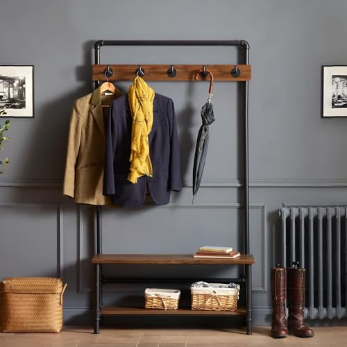 Amig - Porte-manteau avec étagère à chaussures Lukïen | Meuble d'entrée avec banc de style industriel | 183x66x32,5 cm | Métal et bois | Noir et marron | Meuble de couloir ou d'entrée