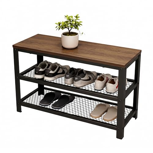 Relaxdays Banc à Chaussures 6 Paires, 2 Niveaux, Assise Effet Bois, 45×73×30 cm, Brun/Noir