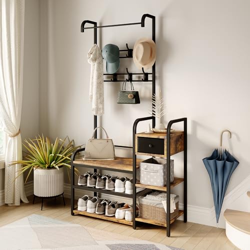 GarveeHome Porte-manteau Banc d'Entrée 5-en-1 avec Tiroir - Vestiaire 8 Crochets Industriels Solides - Banc Rangement Style Rustique Brun pour Appartement/Chambre