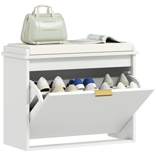 HOMCOM Banc à Chaussures Meuble à Chaussures avec Coussin d'assise rembourré et tiroir Rabattable, Banc d'entrée pour Couloir, Chambre, 62 x 26 x 47,5 cm, Blanc