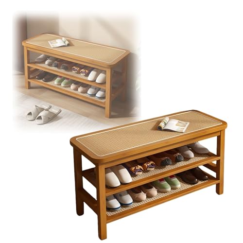 Générique Banc à Chaussures en Bambou avec Assise en rotin et étagère à Chaussures à 3 Niveaux, Meuble Multifonctionnel élégant et Peu encombrant pour entrée, Couloir et Salon, 80 cm