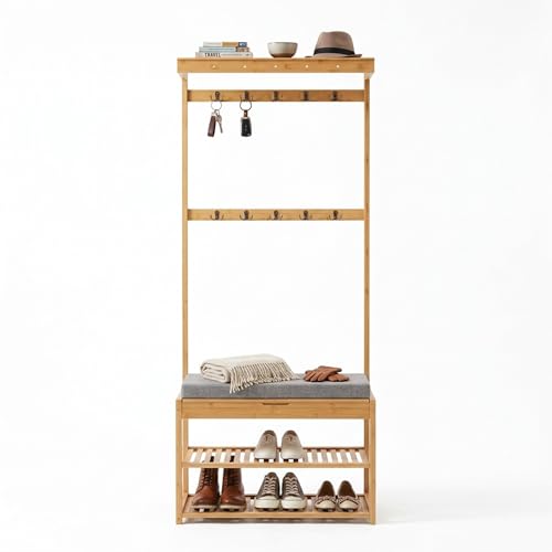 Banc à Chaussures en Bambou avec Rangement 3 en 1, Porte-Manteau et Rangement à Chaussures pour entrée, Meuble indépendant pour Chambre, élégant, 70 cm, Indispensable pour Le Couloir