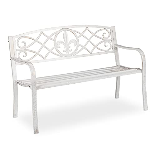 Relaxdays Banc de Jardin, Solide, en métal, siège avec Dossier en Fonte pour l’extérieur, 86 x 127 x 57cm, Blanc/Bronze