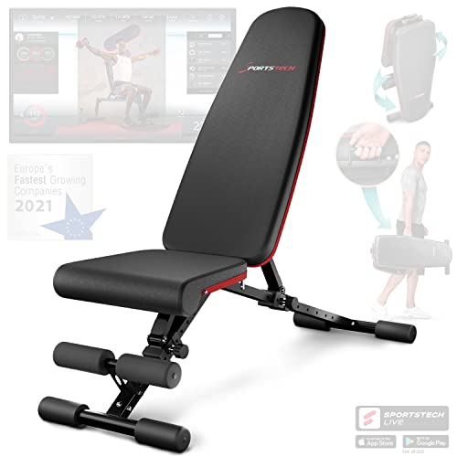 Banc de musculation Sportstech, haute qualité, incliné et plat, charge maximale 180 kg, pour l'entraînement des abdominaux et le fitness + plus de 40 combinaisons pour un usage domestique | BRT400