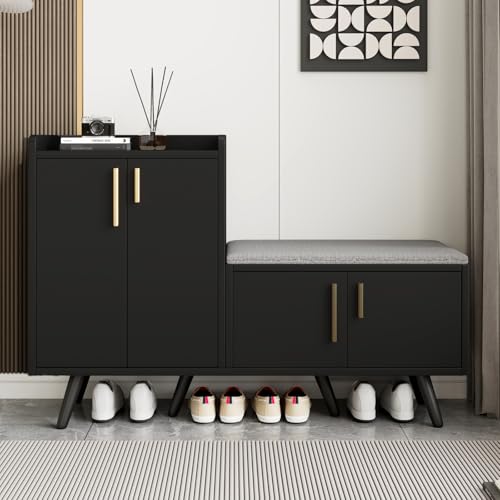 Banc à chaussures moderne en noyer noir avec 4 portes, poignées asymétriques en métal, armoire de rangement élégante, entrée B120 D34 H82, parfait pour la décoration de la maison