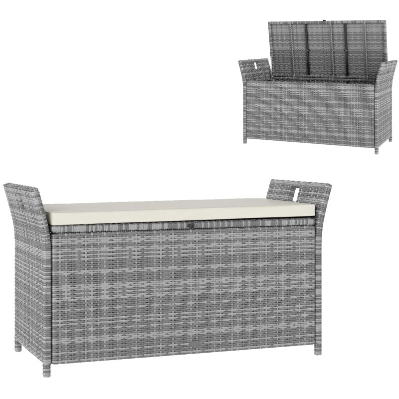 Banc coffre de jardin 2 places - rangement 160L - matelas, 2 coussins - résine tressée effet rotin gris