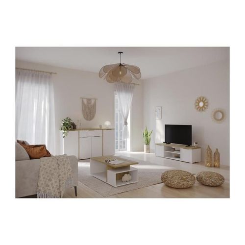 Ensemble Salon ACCESS : Table basse + Banc TV + Enfilade 4 portes - Decor chene Hamilton et blanc