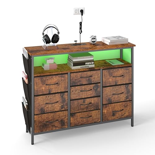 hitsuki Commode TV et banc TV en bois - Buffet TV bas - Meuble TV pour salon avec éclairage LED et 10 tiroirs - Design bois/métal/vintage/industriel - 110 x 30 x 85 cm