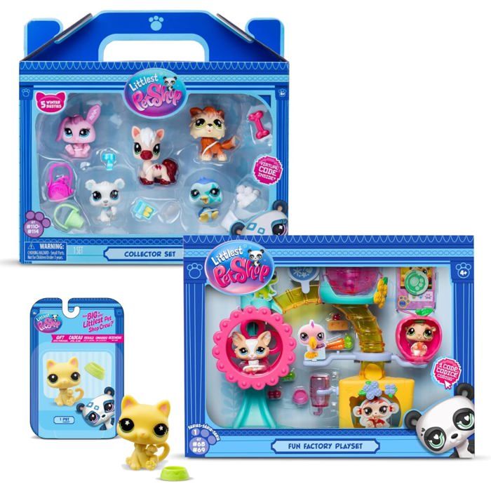 Bandai Littlest Pet Shop BF00617 Lot de 3 Animaux de Compagnie, Accessoire, Carte Collector et Code virtuel, génération 7, Animaux de Compagnie #43, #118, #111, Enfants de 4 Ans +