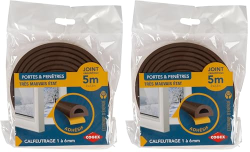 Cogex - Boudins de portes et isolation, Bande de joint portes, fenêtres, Joint isolant en caoutchouc autocollant brun, Calfeutrage adhésif caoutchouc, Profil : D/9mm x 5m (ép : 6mm) (2 x 2,5m) Marron